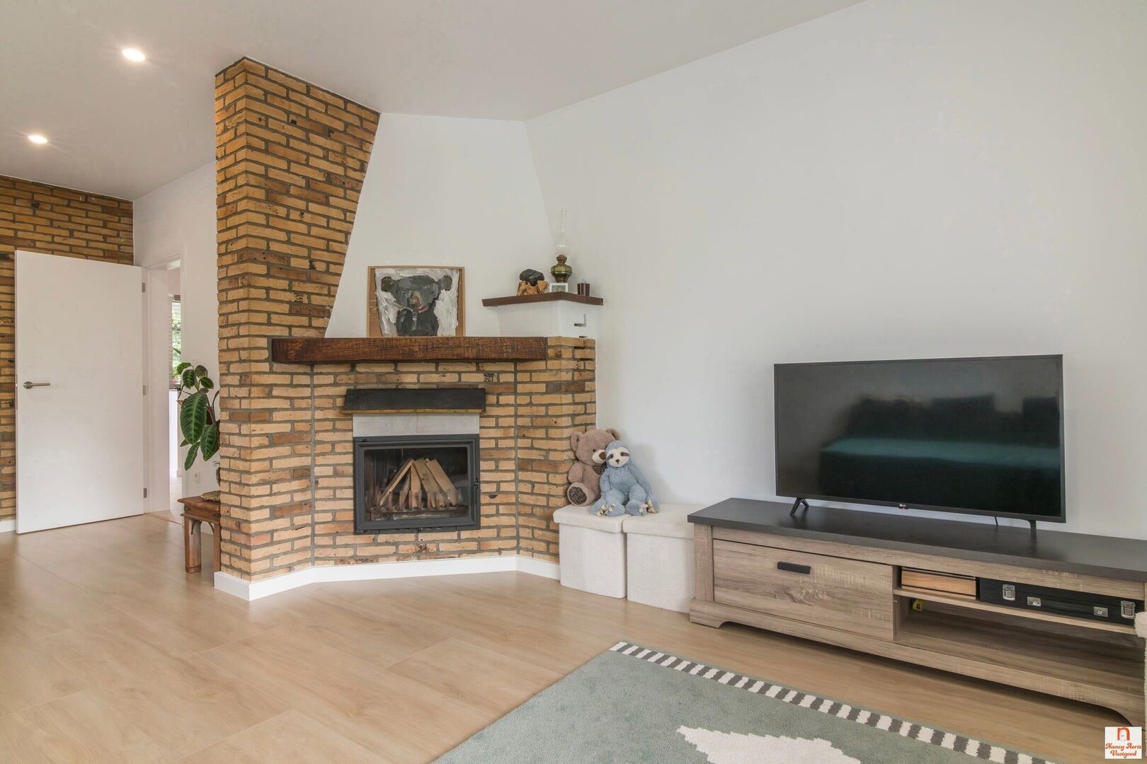 De woonkamer baadt in het licht dankzij de grote ramen en de gunstige zuidwestoriëntatie. Een houtkachel zorgt voor extra warmte en sfeer tijdens de wintermaanden. Op dezelfde verdieping bevindt zich de badkamer, uitgerust met een ingebouwd lavabomeubel, een ligbad met douchefunctie en een hangtoilet.
