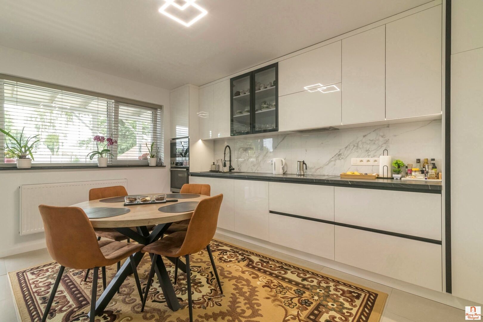 De inkomhal voelt ruim en aangenaam aan en vormt de toegang tot de leefruimtes. De grote, lichte keuken sluit mooi aan op de woonkamer en biedt veel werk- en opbergruimte. Vanuit de keuken stap je rechtstreeks het ruime terras op, met zicht op de achterliggende tuin. Naast de keuken bevindt zich een handige berging met aansluitingen voor wasmachine en droogkast.