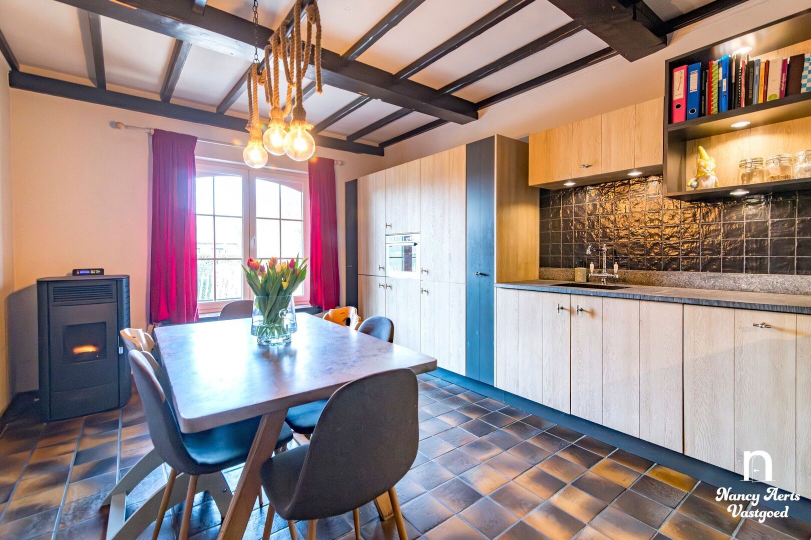 De keuken sluit naadloos aan op de eetkamer en werd recent vernieuwd in een stijl die modern en landelijk moeiteloos verzoent. Het werkblad in blauwe steen geeft karakter, terwijl de indeling praktisch en doordacht blijft. Dit is een plek waar niet alleen gekookt wordt, maar waar ook geleefd wordt, met ruimte voor een grote tafel. De pelletkachel maakt het geheel extra sfeervol.