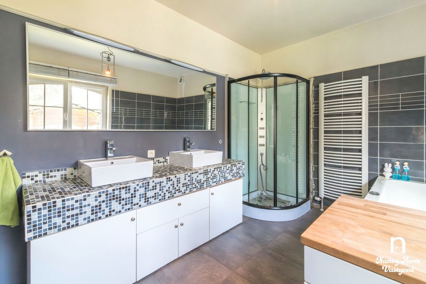Achter de keuken bevindt zich de berging met aansluitingen voor was- en droogkast. Van hieruit bereik je het nachtgedeelte op het gelijkvloers, met een comfortabele slaapkamer en een ruime badkamer voorzien van ligbad, douche en dubbel lavabomeubel, ideaal voor wie graag gelijkvloers woont.