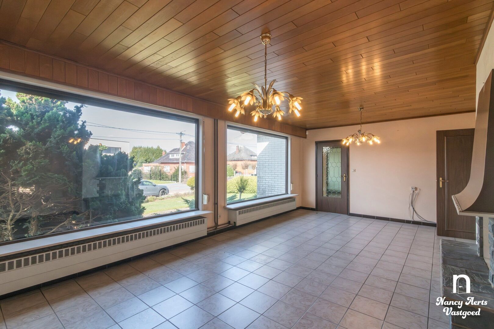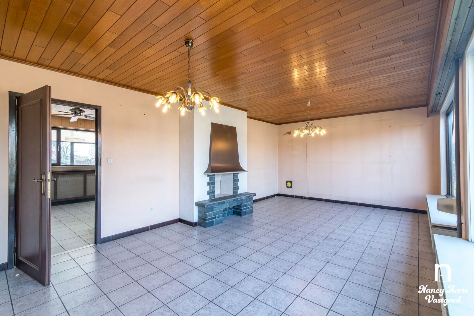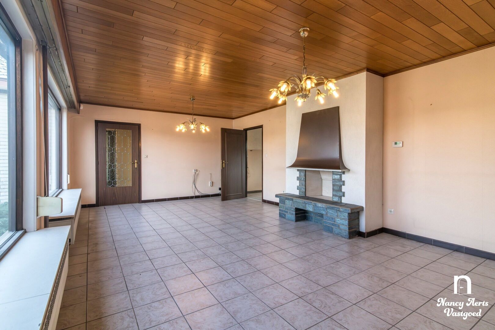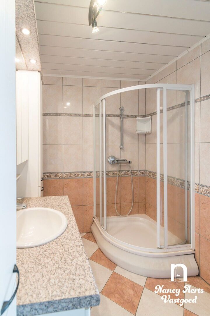 Vooraan in de woning ligt de woonkamer, een aangename ruimte met zeer grote ramen die zorgen voor veel natuurlijk licht. De haard geeft de leefruimte extra karakter en creëert een gezellige sfeer. Vanuit de woonkamer loopt de indeling naadloos over in de ruime leefkeuken. Hier is voldoende plaats voor een eettafel. De praktische L-vormige opstelling van de keukenkasten zorgt voor een efficiënte indeling. Vanuit de keuken kijkt u uit op de zuidgerichte tuin, waar u de hele dag door van de zon kan genieten. In de keuken is bovendien een aircocasette voorzien.