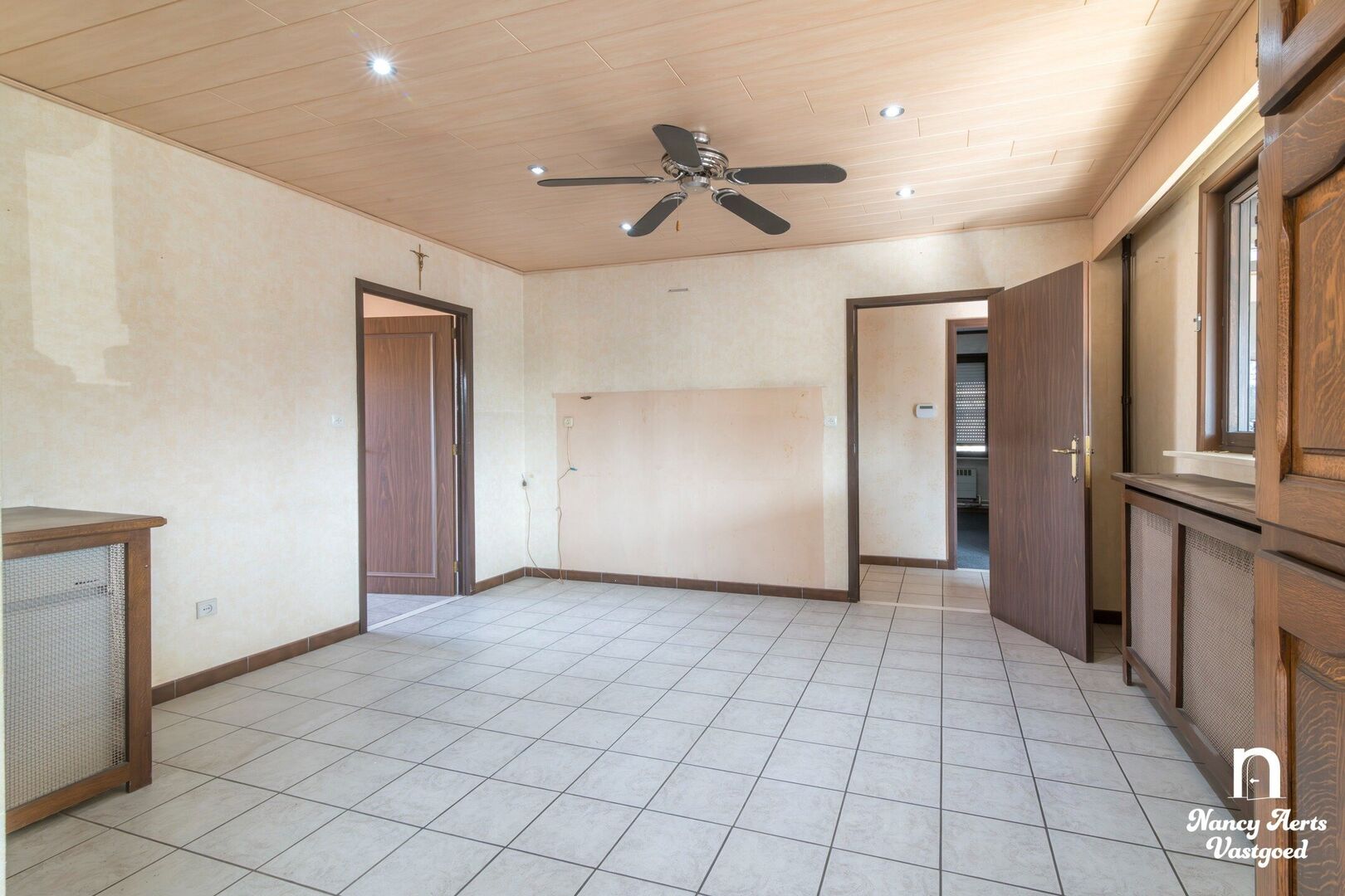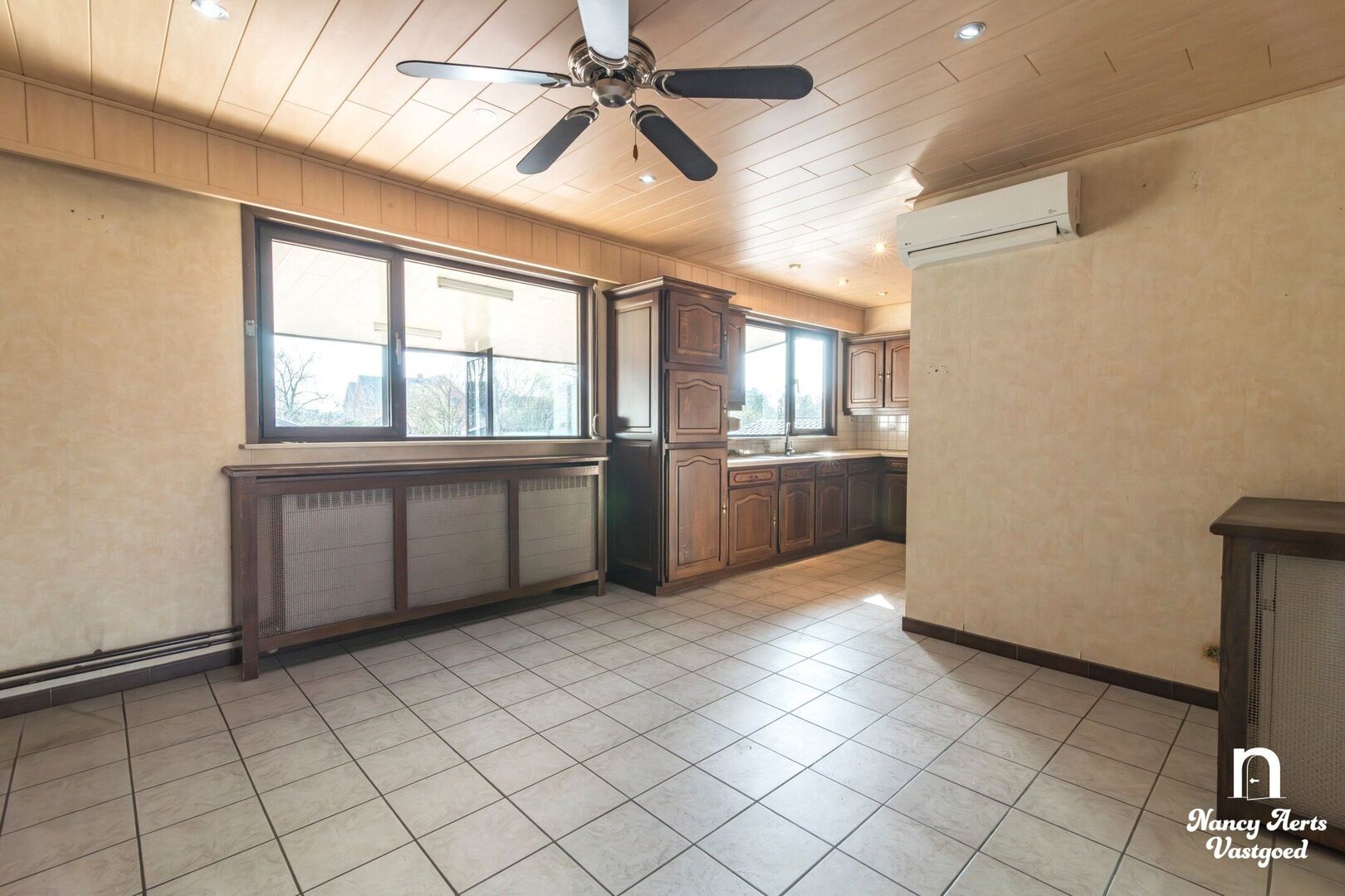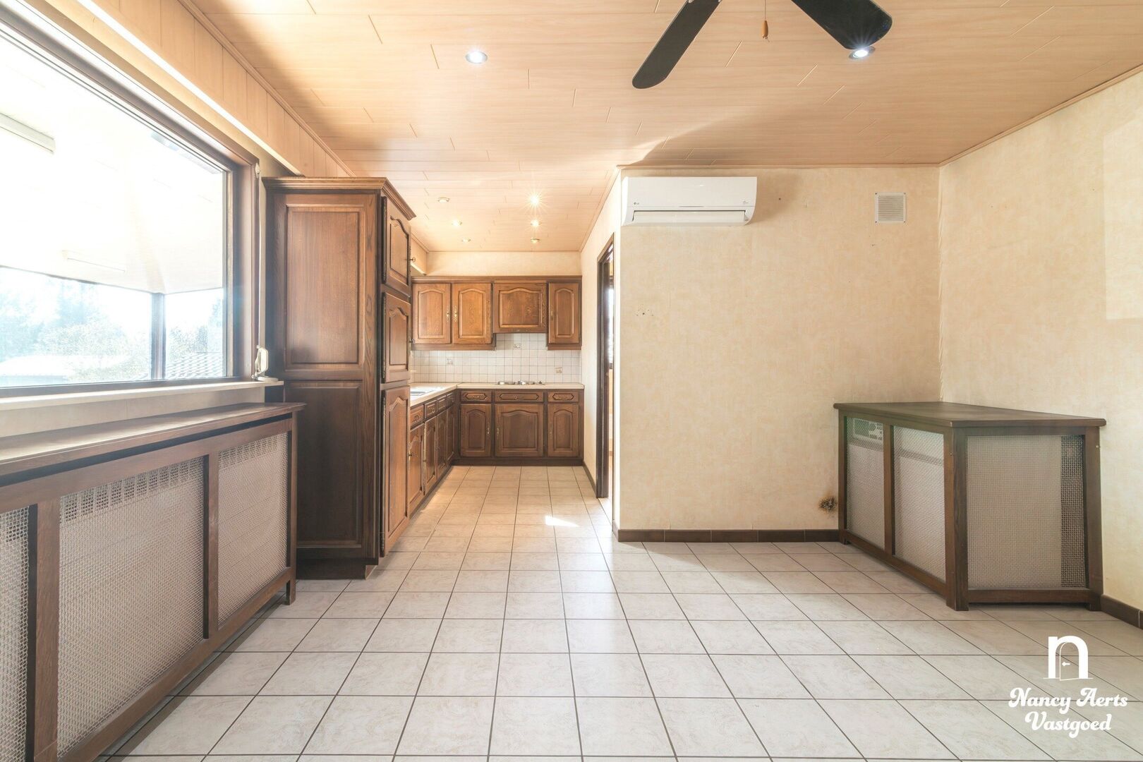 Vooraan in de woning ligt de woonkamer, een aangename ruimte met zeer grote ramen die zorgen voor veel natuurlijk licht. De haard geeft de leefruimte extra karakter en creëert een gezellige sfeer. Vanuit de woonkamer loopt de indeling naadloos over in de ruime leefkeuken. Hier is voldoende plaats voor een eettafel. De praktische L-vormige opstelling van de keukenkasten zorgt voor een efficiënte indeling. Vanuit de keuken kijkt u uit op de zuidgerichte tuin, waar u de hele dag door van de zon kan genieten. In de keuken is bovendien een aircocasette voorzien.