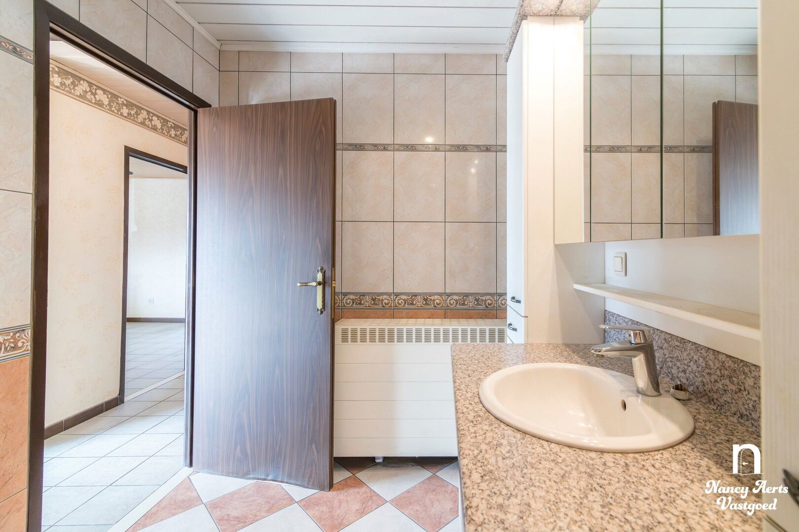 Naast de keuken bevindt zich een handige bergruimte met aansluiting voor een wasmachine en droogkast. Zowel vanuit de woonkamer als vanuit de keuken bereikt u de nachthal. Hier bevinden zich drie slaapkamers, waarvan één is uitgerust met ingebouwde kasten. Eén kamer is voorzien van een aircocasette. Ook de badkamer met lavabomeubel en douche en het aparte toilet sluiten aan op deze hal.