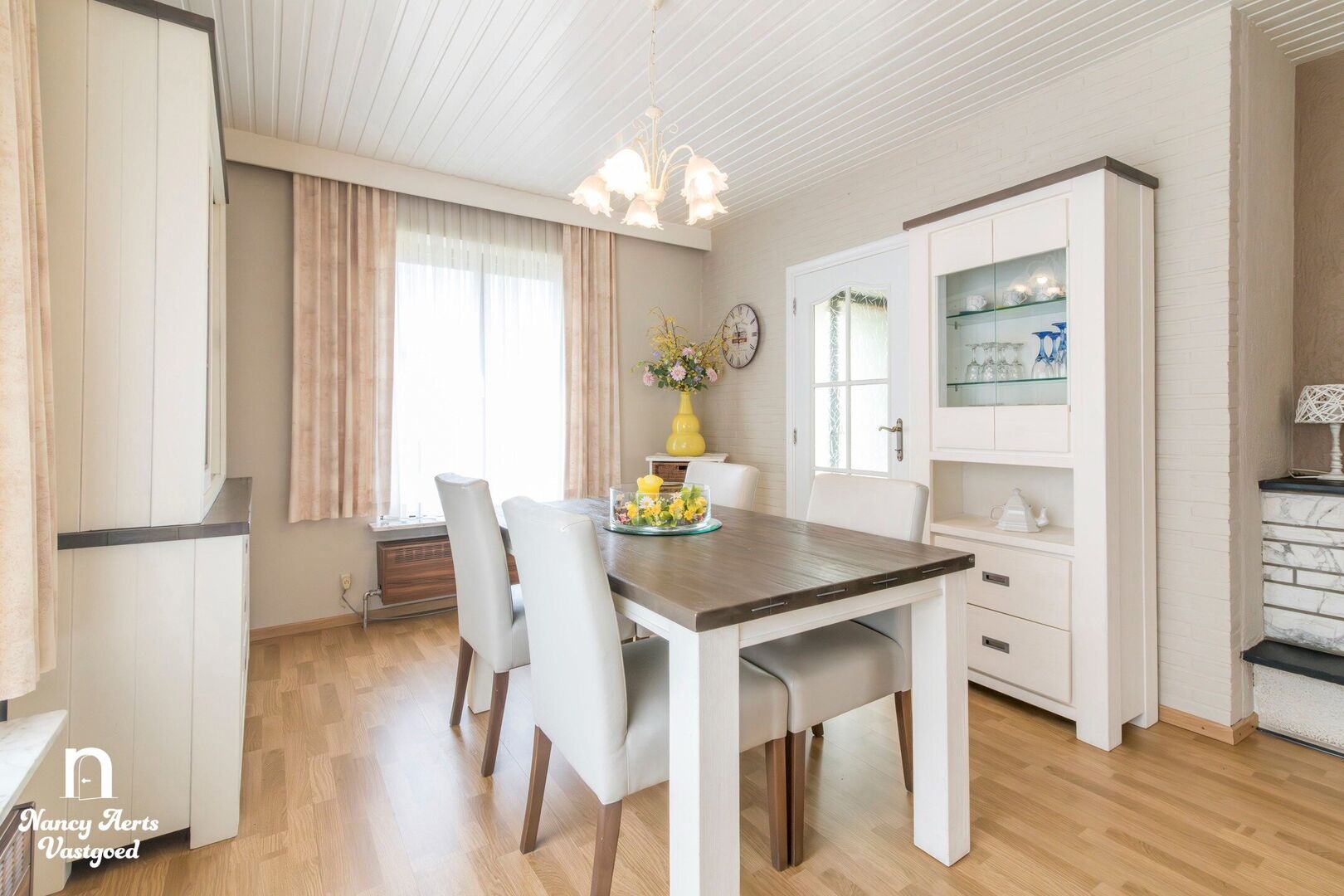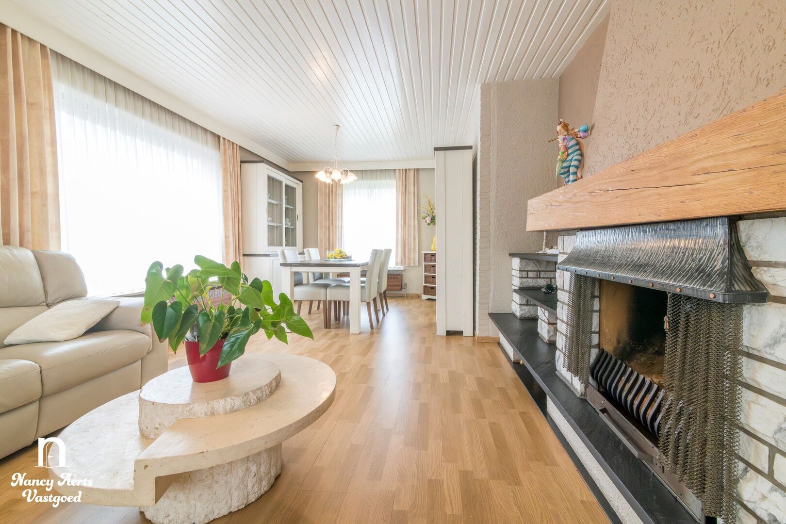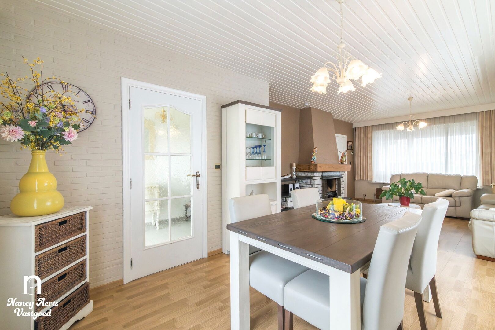 Via de inkomhal kom je in de lichtrijke leefruimte, die een open gevoel geeft. Hier is plaats voor een eet- en zithoek. In de zithoek bevindt zich nog de originele open haard. Aansluitend ligt de keuken, ingericht als een praktische werkruimte met aan de ene zijde de spoelbak met zicht op de tuin. Er is ook plaats voor een eettafel.