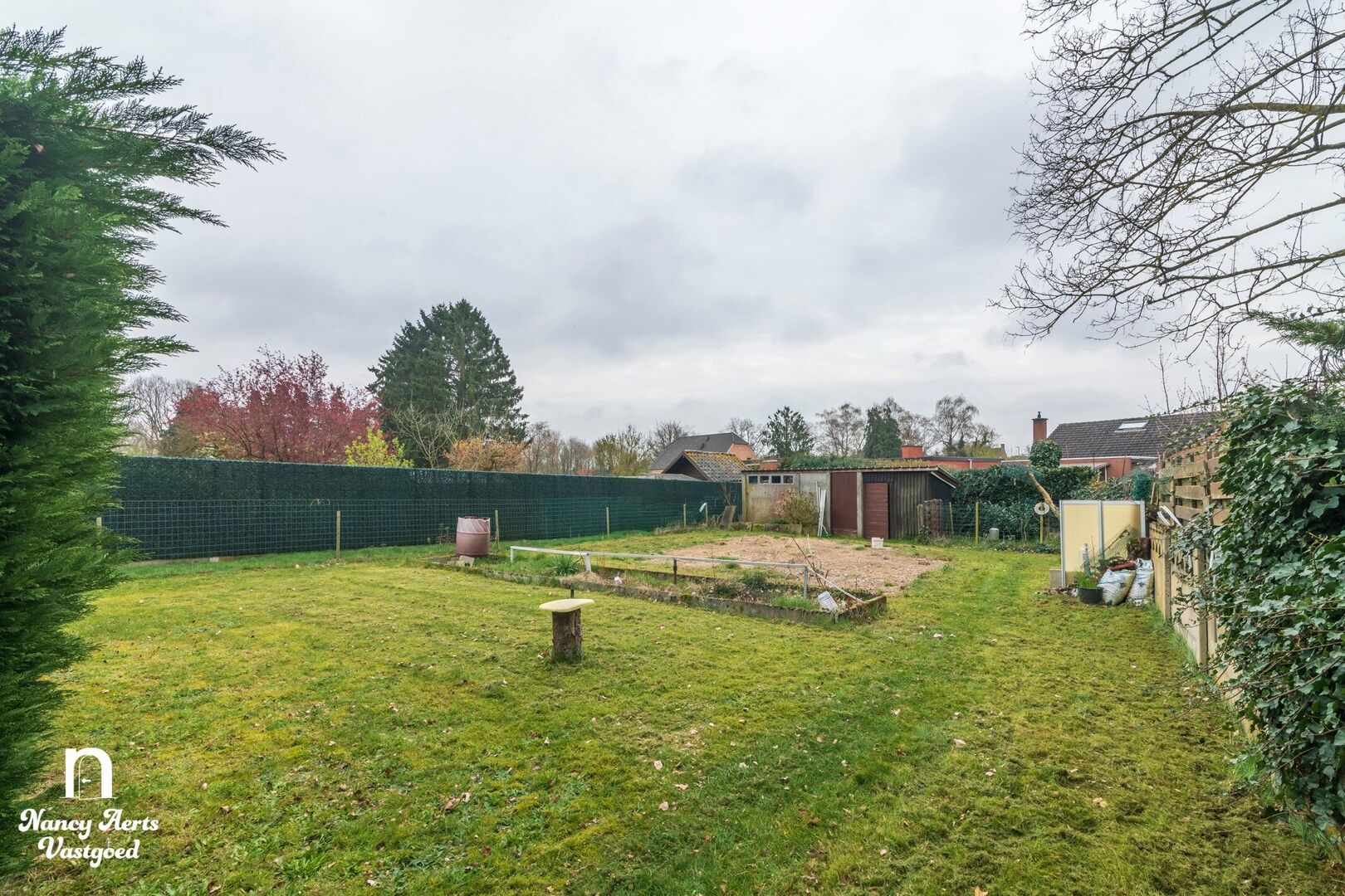 De tuin is zuidgericht en ingedeeld in een grasperk met achteraan een zone die eerder als moestuin werd gebruikt.