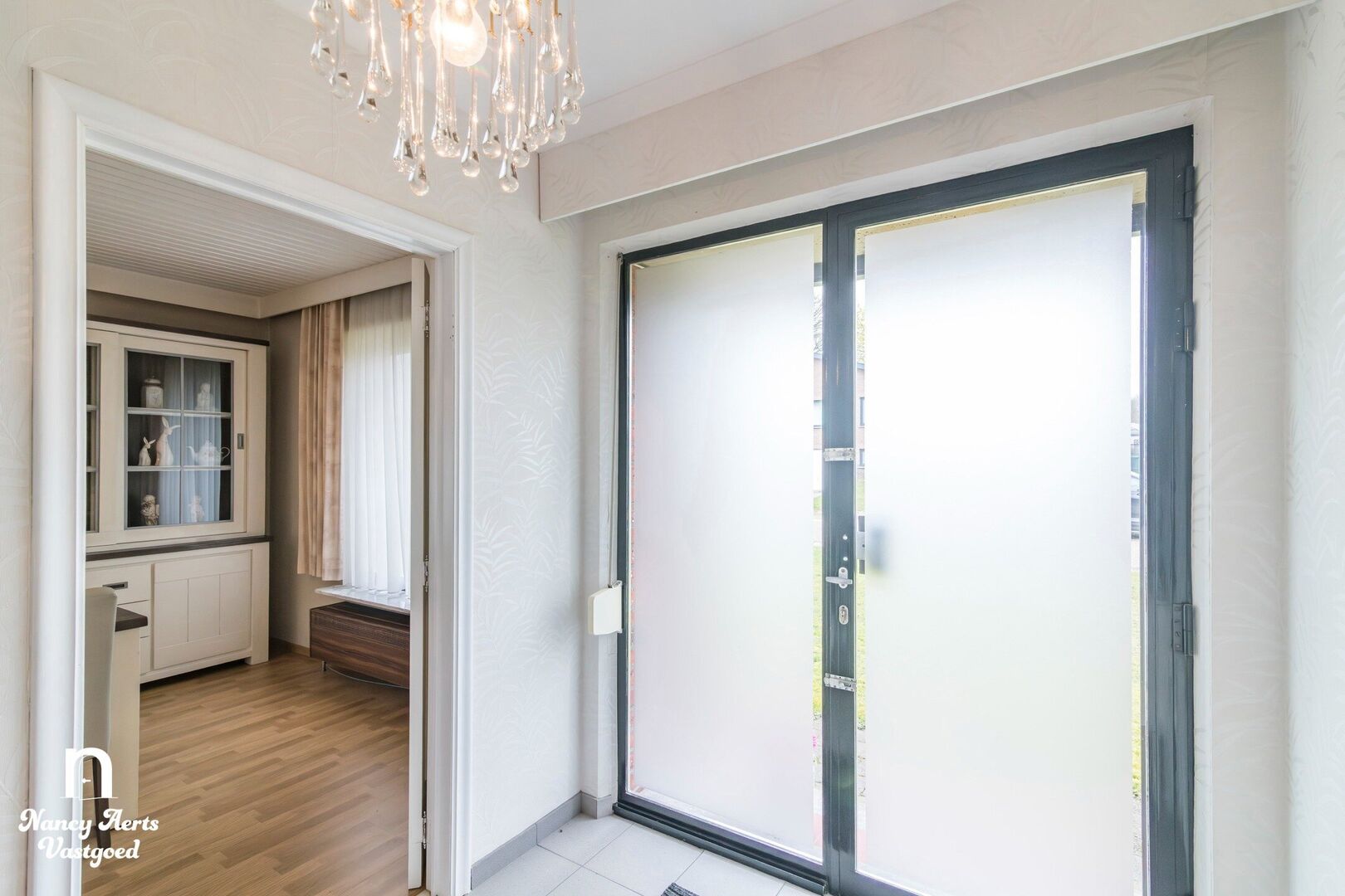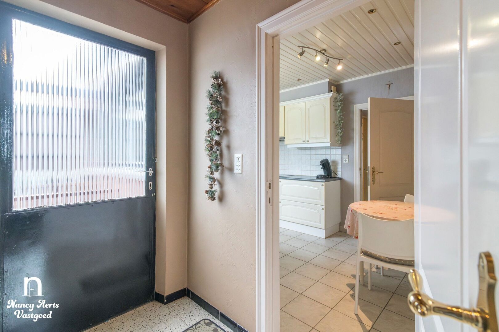 Achter de keuken bevindt zich een halletje met toegang tot de tuin en het overdekte terras. Hier zijn ook het toilet, twee bergingen, waarvan één met aansluiting voor wasmachine en droogkast en de doorgang naar de inpandige garage achteraan de woning.
