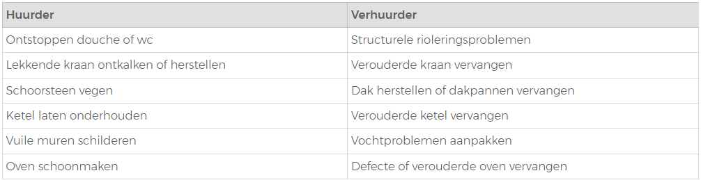 De huurder staat in voor de kleinere, gebruiksgebonden herstellingen. Dit zijn meestal courante onderhoudswerken of herstellingen als gevolg van eigen gebruik of nalatigheid. Denk aan: