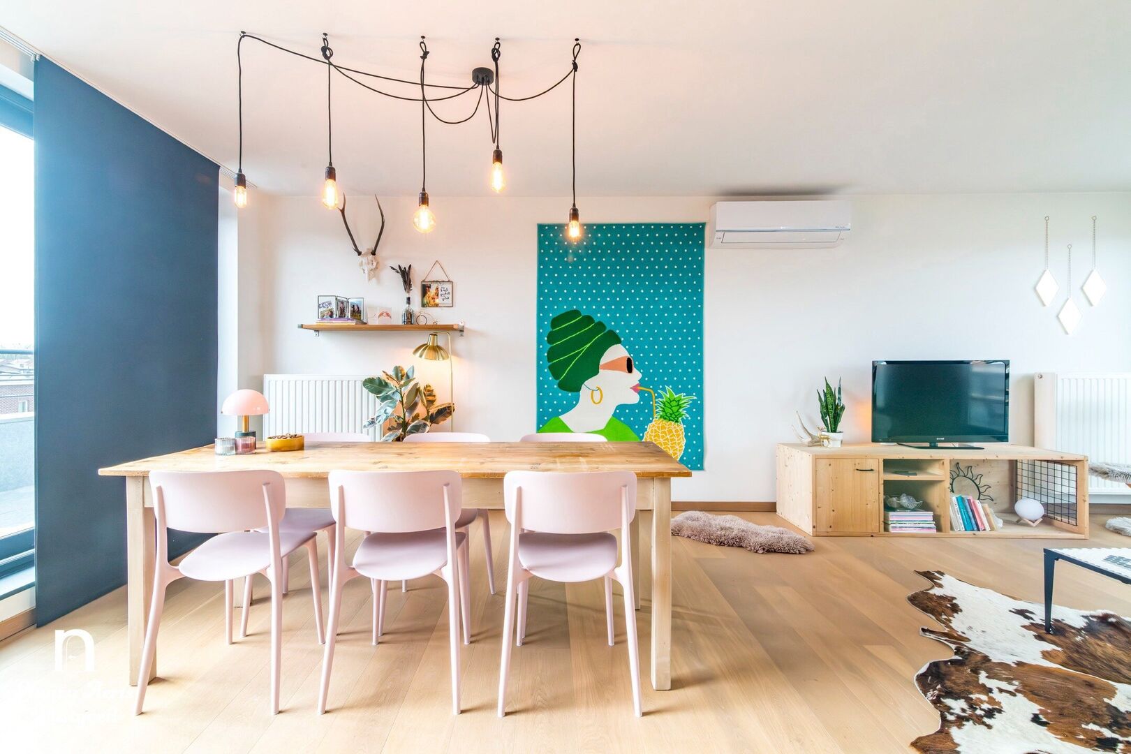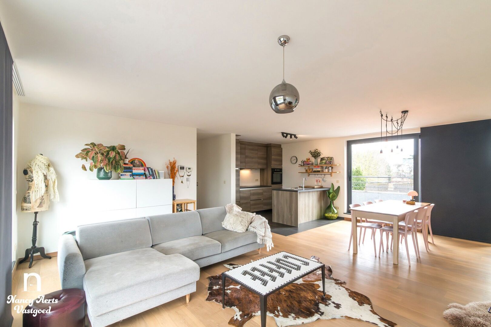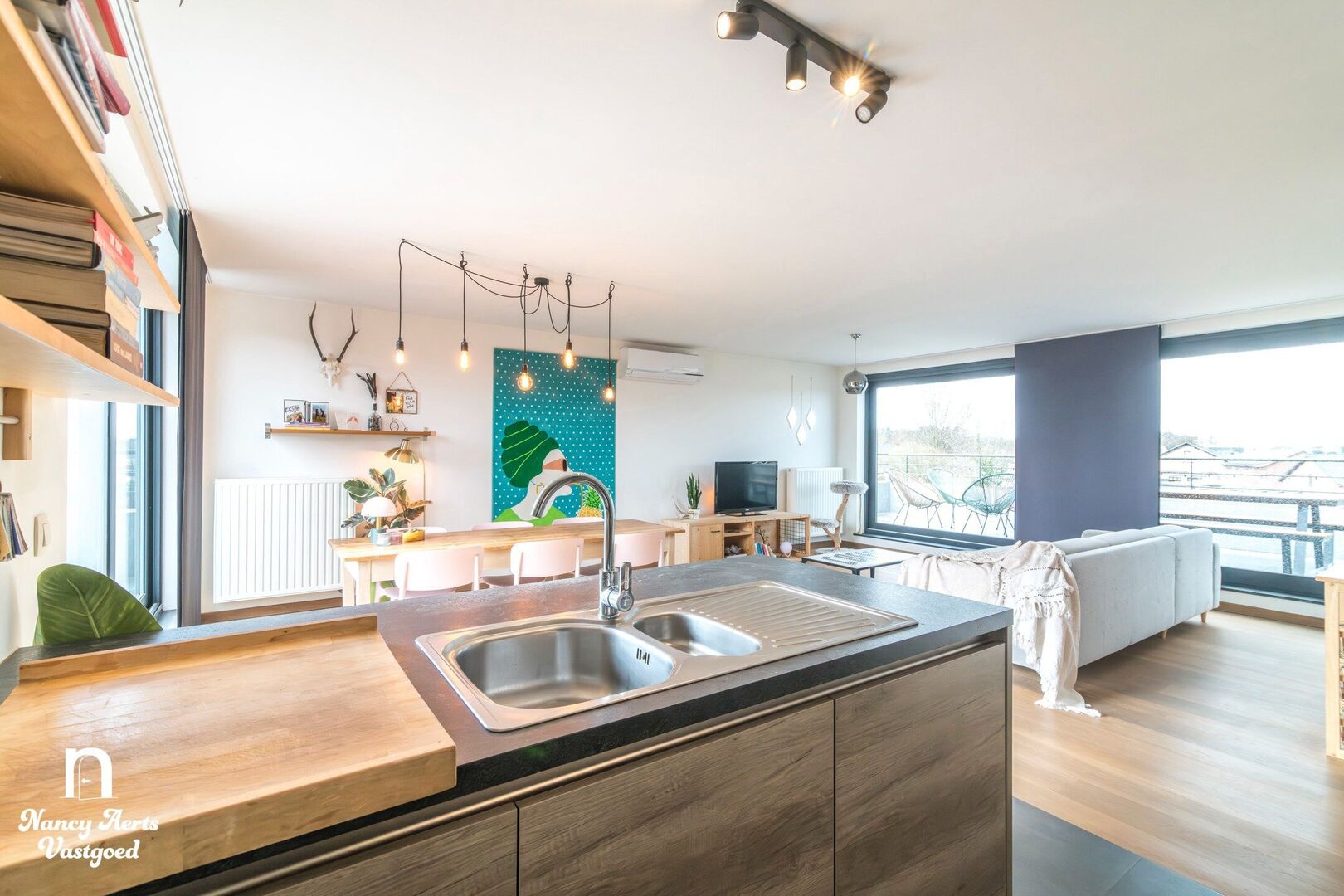 De leefruimte vormt het centrale punt van de woning en biedt een mooie balans tussen ruimte en gebruiksgemak. Er is plaats voor een comfortabele zithoek en een royale eettafel. In dezelfde open ruimte bevindt zich de keuken met keukeneiland, die naadloos aansluit op het geheel en zorgt voor een vlotte indeling. Doorheen het appartement werd parket gecombineerd met keramische tegels, wat zorgt voor een verzorgde en tijdloze uitstraling.