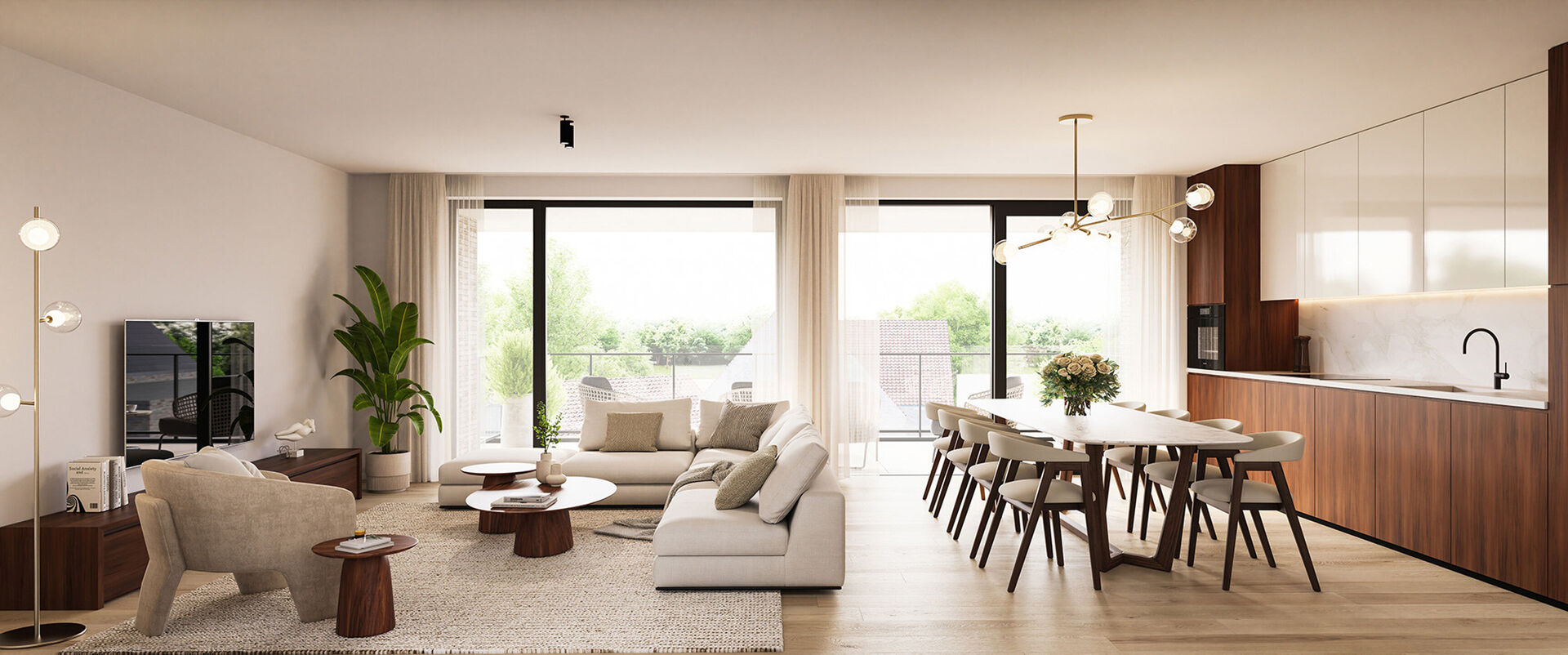 De woonkamer en volledig uitgeruste keuken vormen één open geheel – perfect voor gezellige avonden of stijlvolle diners. De grote raampartijen zorgen voor een luchtig en ruimtelijk gevoel.