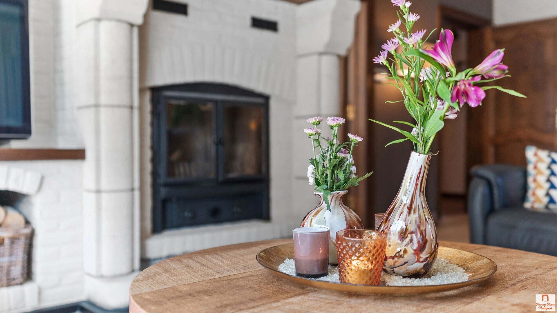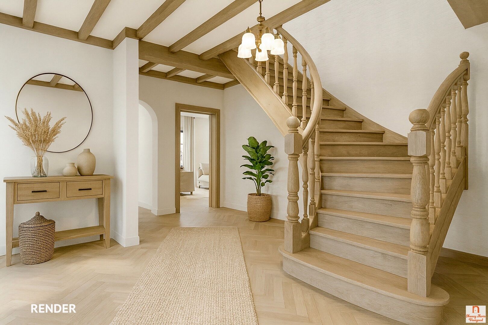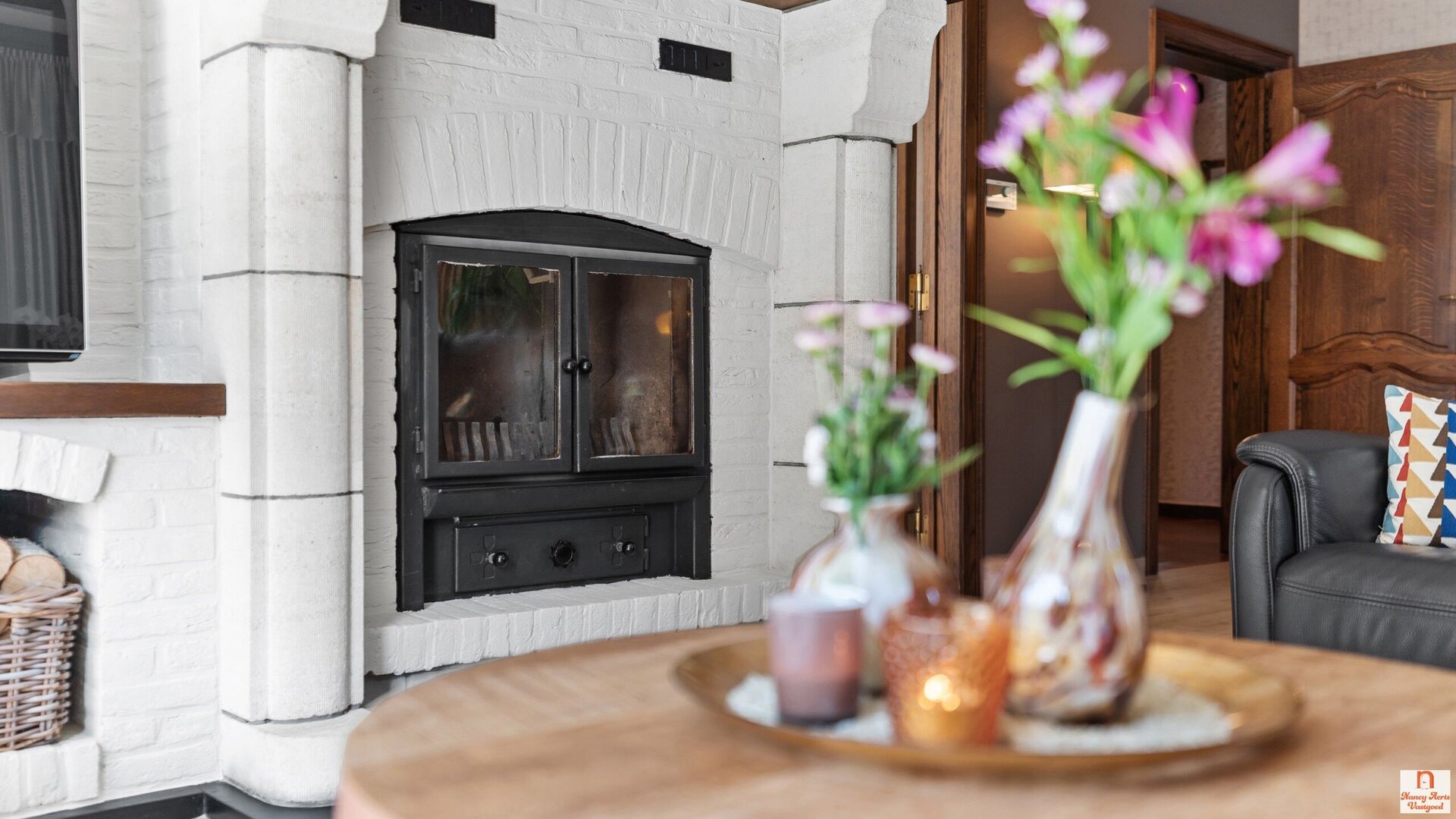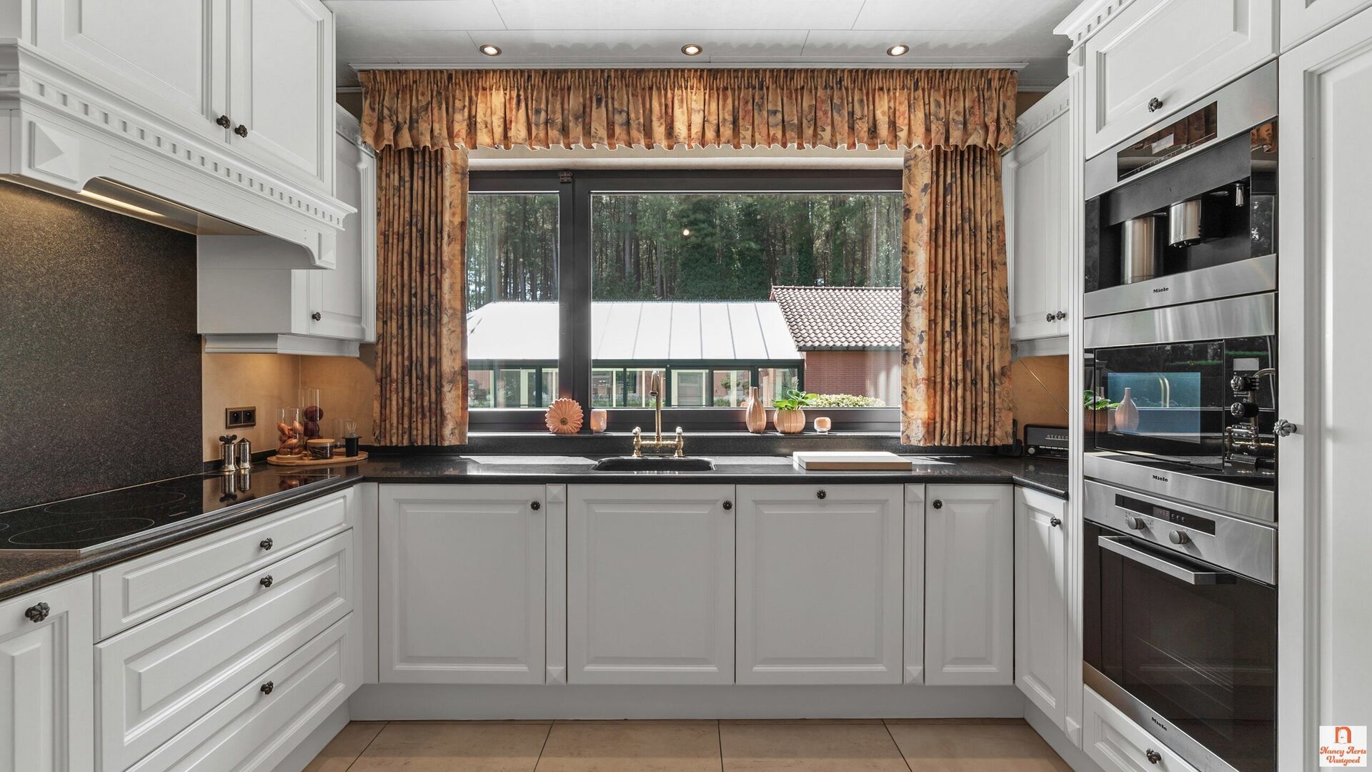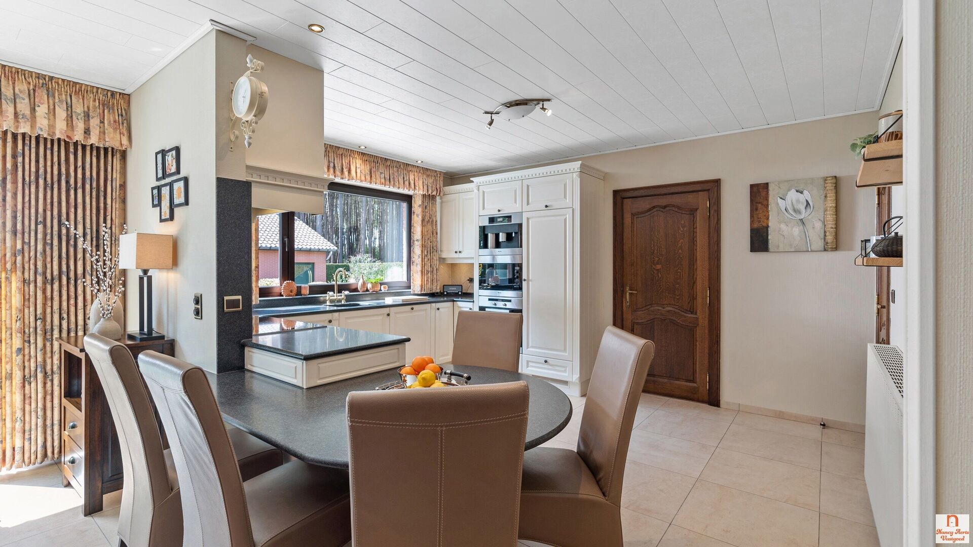 Via de statige oprit met elektrische poort kom je aan bij de woning. De inkomhal is royaal en meteen indrukwekkend, met de eiken trap als warme blikvanger. Van hieruit bereik je alle belangrijke ruimtes: het bureel, de lichtrijke woonkamer met open haard en schuifraam naar de tuin, de eetruimte en de open keuken met zicht op het zuidwestgerichte buitenleven. Aansluitend aan de keuken vind je een praktische berging met inbouwkasten, plaats voor was- en droogtoestellen en een apart toilet. Ook de slaapkamers, garage en kelder zijn rechtstreeks bereikbaar vanuit de hal.