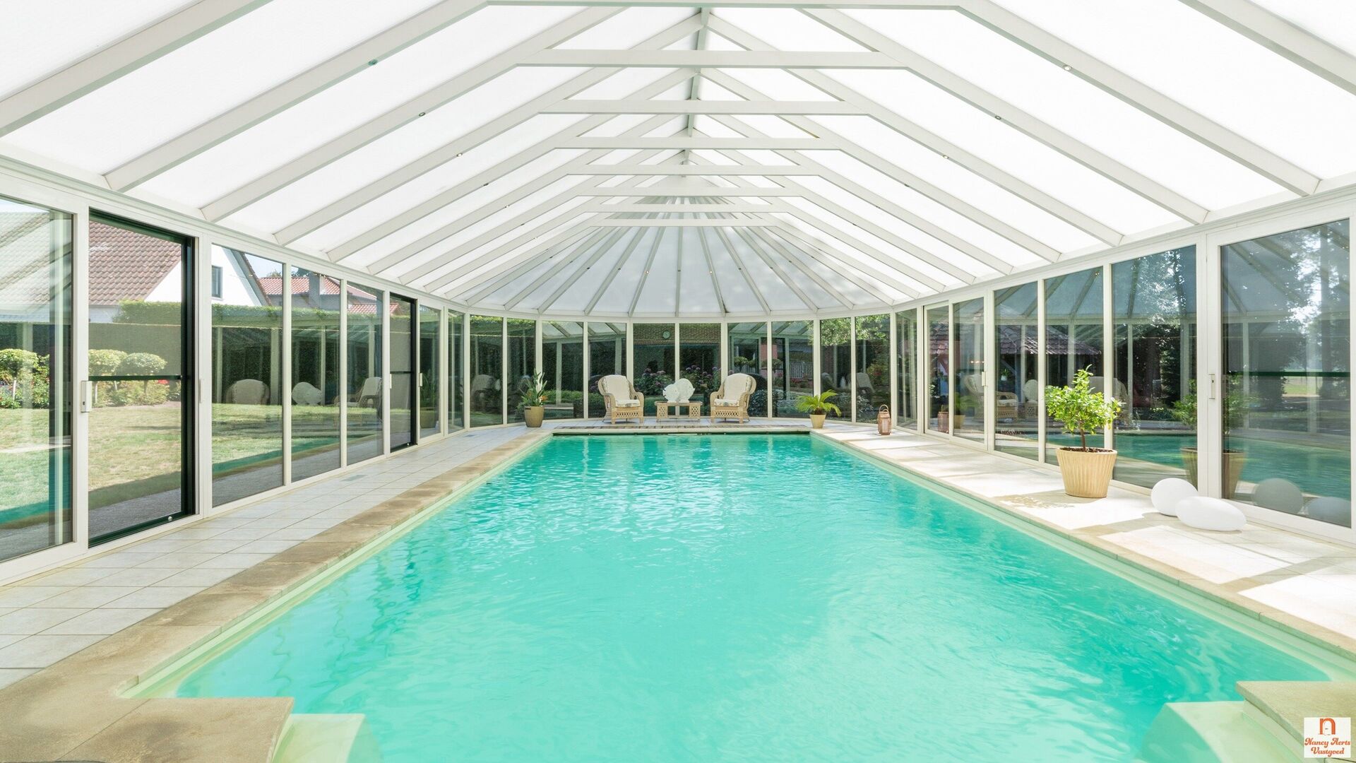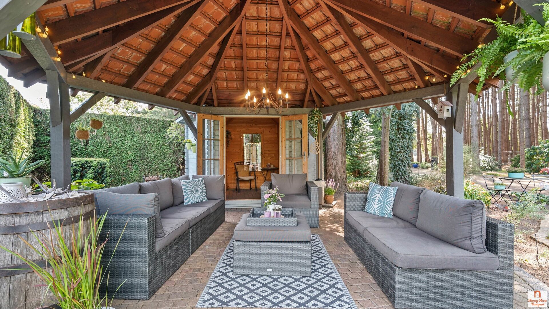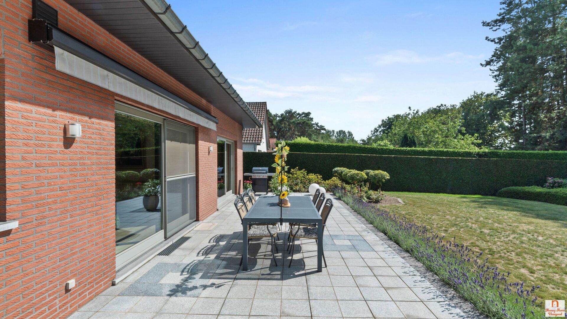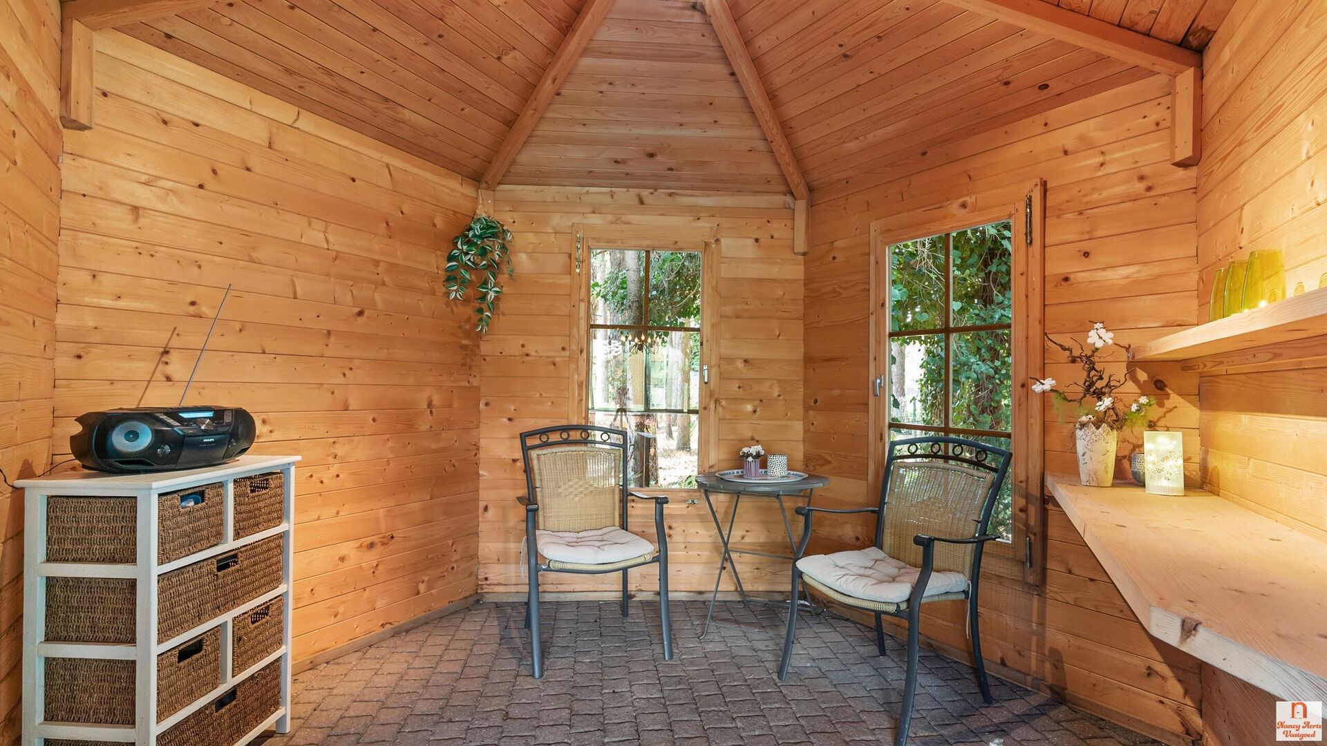 De tuin is prachtig aangelegd en straalt rust uit. Het overdekte zwembad in veranda-constructie is zonder twijfel het pronkstuk. Deze ruimte is volledig uitgerust met een keukenhoek, douche, toilet, kleedkamer en sauna. Een plek waar ontspanning centraal staat. Verder is er een charmante pergola met tuinhuis, momenteel ingericht als gezellige zitruimte, waardoor je ook op frissere dagen kunt genieten van het buitenleven. De fontein en de sfeervolle beplanting maken het plaatje compleet.